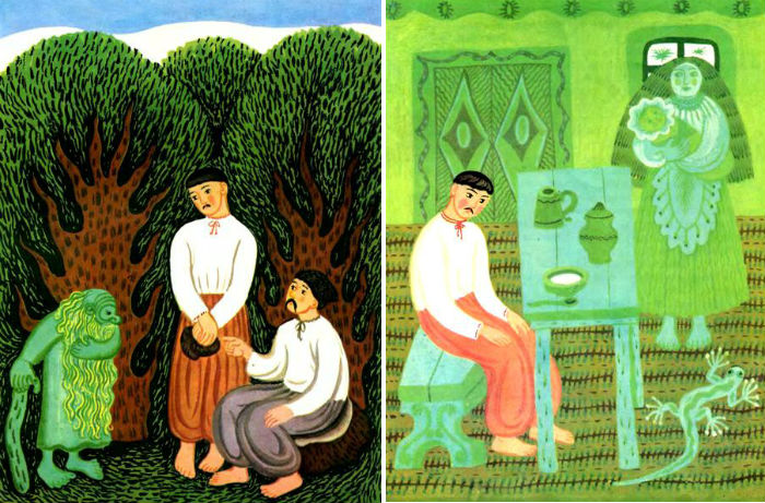 1. Маленький дідок, сам зморщений, а борода зелена аж по коліна. І хатка в нього зелена, і в тій хатці усе зелене: і стіни, і лавки. І жінка в нього зелена, і діти, сказано — все-все... А за наймичок у нього мавки — такі зелені, як рута!..