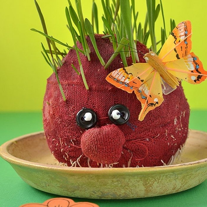 Небольшое количество земли перемешай с семенами и заполни нижнюю часть носка, а верхнюю — только землей. Свяжи носок и с помощью иголки с ниткой сформируй носик, а также пришей пуговицы для глаз.