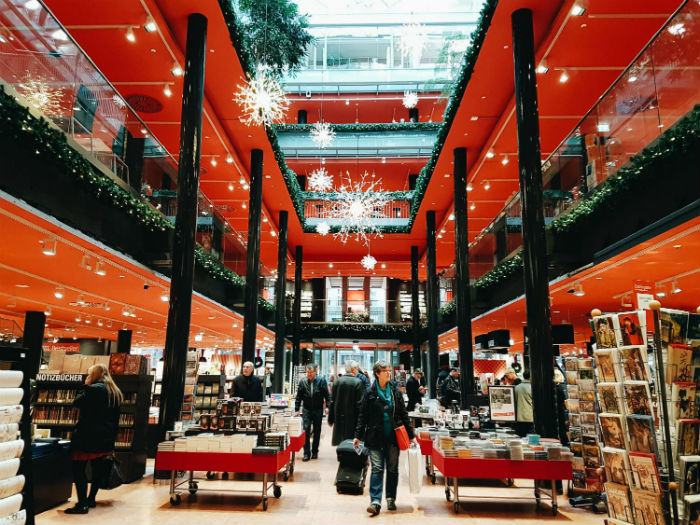 Зайди и в огромный книжный магазин Dussmann — здесь можно не только приобрести книги, но и просто почитать их в специально отведенном уютном месте.