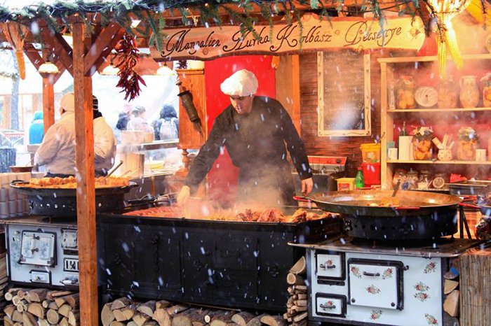 Колоритный праздник живота ждет гурманов в Будапеште. На рождественской ярмарке возле базилики Святого Иштвана накормят особой зимней салями, гуляшом с черносливом и сэндвичами с бараниной и жареной паприкой.