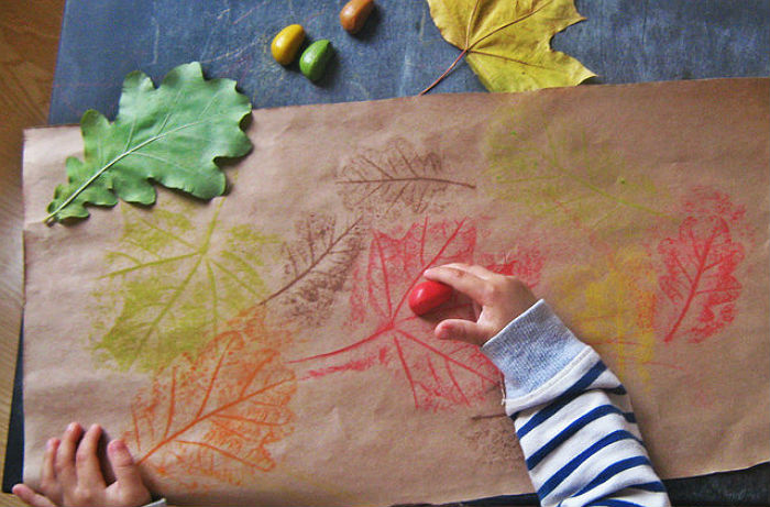 Подкладывай листья под различные виды бумаги: пергамент (вощеную бумагу) или кальку — и проявляй узор, заштриховывая лист. Выбирай осенние цвета: красный, желтый или оранжевый, и у Тебя выйдут замечательные атмосферные рисунки.
