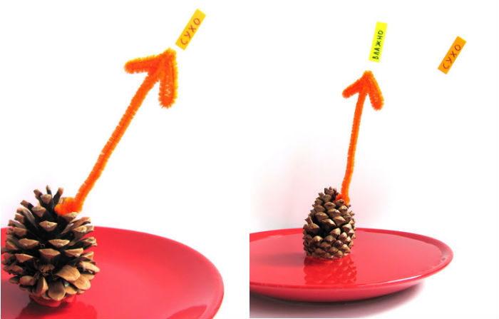 Для создания гигрометра (прибора для определения влажности воздуха) привяжи к одной из чешуек синельную проволоку и сделай из неё стрелочку. Прикрепи шишку к тарелке кусочком пластилина. Отметь, куда показывает стрелка, когда шишка сухая. Теперь Тебе нужно дождаться дождя, но это та-а-ак долго! Поэтому просто налей в миску воды и проверь положение стрелки через час. Чешуйки закроются, а стрелка немного изменит направление, показывая, что влажность воздуха увеличилась.