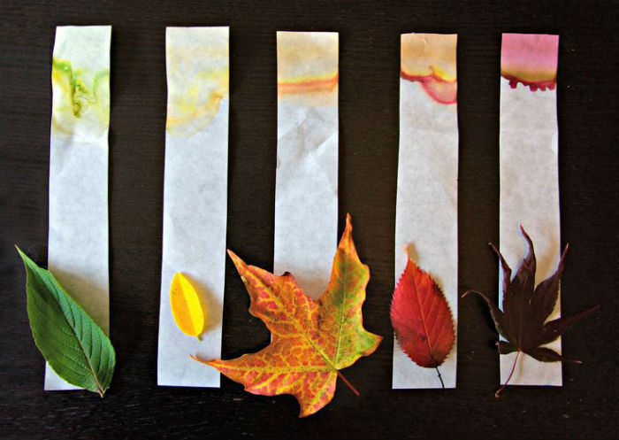 Разорви несколько зеленых листьев на кусочки и растирай в ступке до появления сока. Переложи толченые листья в банку. То же самое сделай с листьями, которые успели изменить цвет. Подпиши каждую банку. Возьми несколько бутылочек спирта и разлей по банкам. С помощью водяной бани нагрей содержание каждой баночки. Нарежь полоски из фильтров и помести один конец в банку, а другой свесь через край. Спустя 30 минут Ты увидишь, как фильтры впитали пигменты. Разглядывать их — невероятное удовольствие.