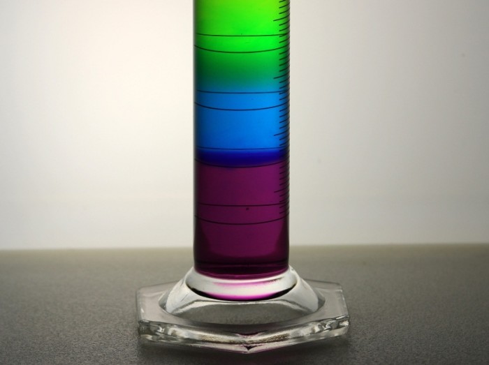 В отдельных сосудах смешивай воду с различным количеством сахара и добавляй красители. Осторожно перелей все жидкости в пустой стакан (снизу — вода с наибольшим количеством сахара, сверху — с наименьшим). Из-за разной плотности жидкостей они не смешаются.