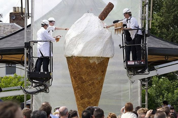 Хестон Блюменталь — шеф-кухар з Великобританії, який потрапив до Книги рекордів Гіннеса. Саме він створив найбільше у світі морозиво — висотою 4 метри і тонною ваги. На його заморозку пішло більше місяця, але результат вразив всіх! Цікаво, скільки б часу пішло на те, щоб його з'їсти?