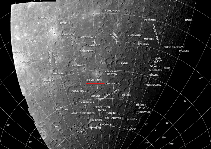 В 70-х годах ХХ века произошло знаменательное событие. Автоматическая станция «Маринер–10», которая трижды пролетала мимо Меркурия, впервые сфотографировала планету с близкого расстояния. Именно тогда земляне узнали: поверхность Меркурия покрывают многочисленные кратеры. Международный астрономический союз традиционно решил назвать их в честь выдающихся музыкантов, художников и писателей. Так одному из 300 кратеров Меркурия досталось имя нашего Тараса Григорьевича. Гигантское углубление имеет диаметр 137 километров.