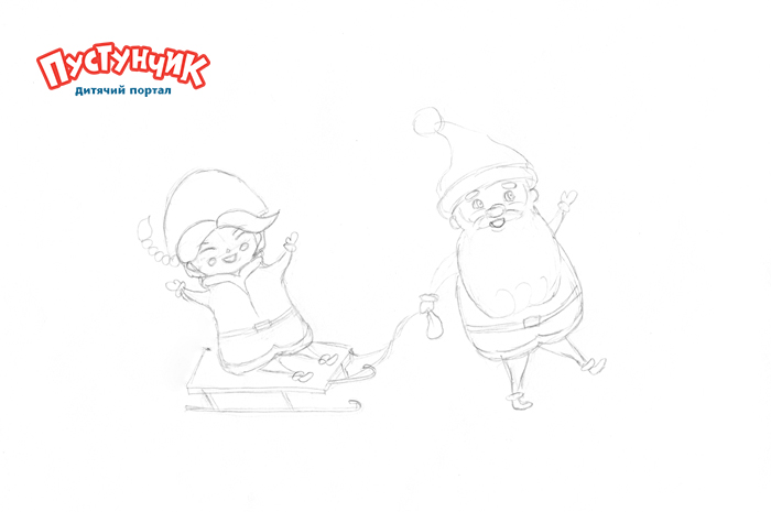 6. Сотри вспомогательные линии и нарисуй Деду Морозу кучерявую бороду с шапкой, а его маленькой внучке — роскошную косу.