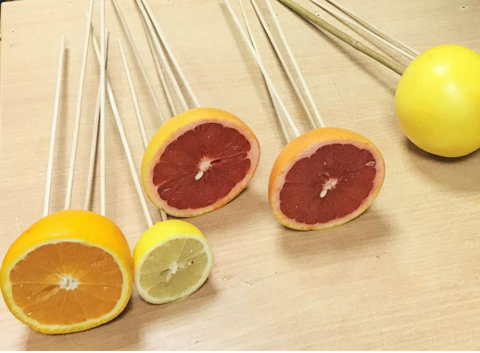 Секрет № 1. Если фрукт или овощ очень тяжелый (например, грейпфрут, свёкла или гранат), используй флористические бамбуковые палочки. Они прекрасно выдержат такой витаминный груз.