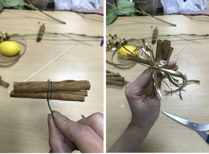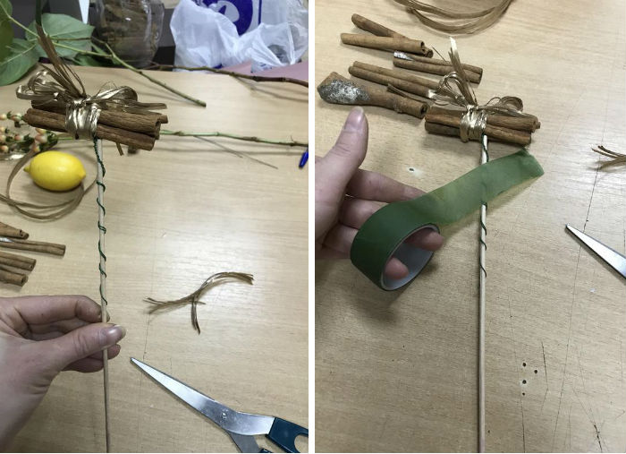 4. Чтобы фруктовая композиция смотрелась интереснее, добавь к основному составу маленькие украшения. Это могут быть: угольник, пенопластовый мячик-глобус или обычные палочки корицы, перевязанные лентой.