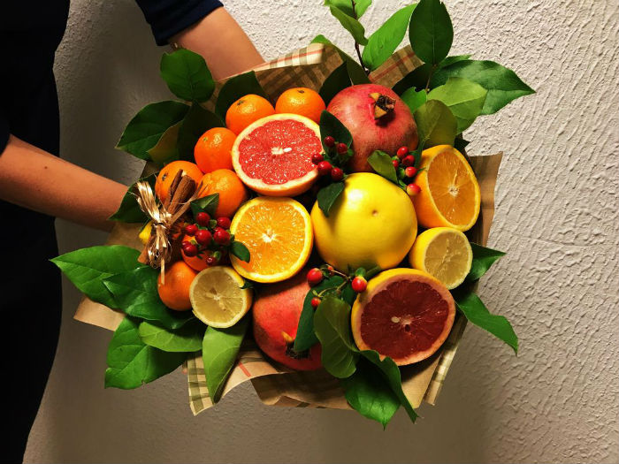 Секрет № 4. Чтобы фрукты не потеряли свежесть и привлекательный вид, изготовлятьбукет за несколько часов до выхода из дома. Никто не хочет получить в подарок увядший лимон или усохшие сливки!