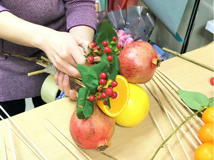 3. Начинай собирать букет. Массивные фрукты расположи в середине, маленькие — по кругу. Чтобы букет хорошо держал форму, не забывай тщательно обматывать каждый фрукт скотчем внизу шпажки.