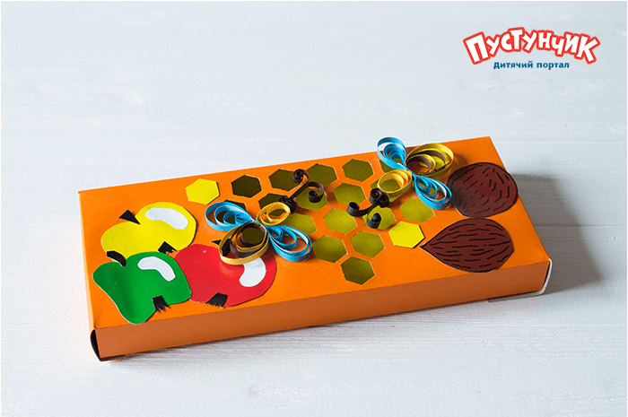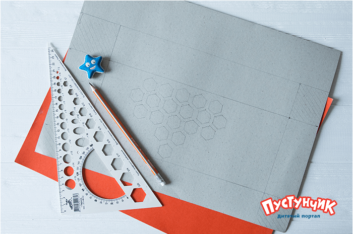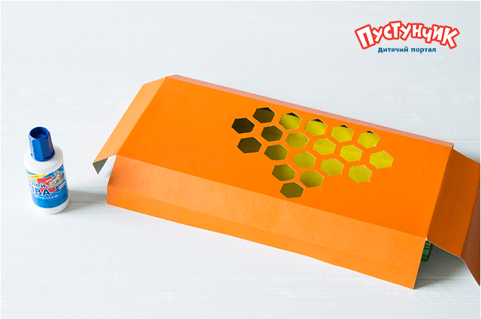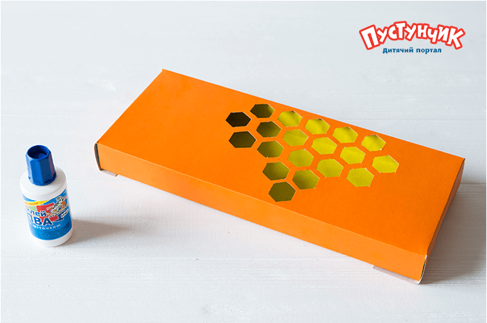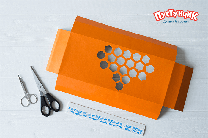 Чтобы создать впечатление пчелиных сотов, нашу заготовку нужно будет обернуть оранжевым картоном с маленькими шестиугольными отверстиями. Смотри, как это сделать.