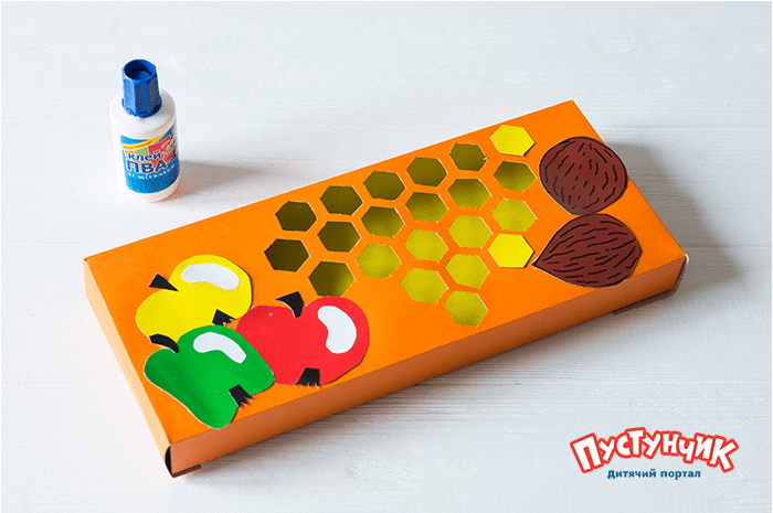 7. Приклей яблоки, орехи и шестиугольные ячейки к основанию панно — пчелиным сотам.