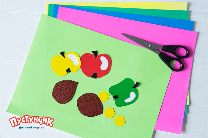 6. Пока на пчелках высыхает клей, вырежи из цветного картона яблоки разных форм. Следи, чтобы фрукты подходили для панно по размеру. Добавь реалистичности, изготовив черные хвостики и чашелистики, а также блики света из белой бумаги.