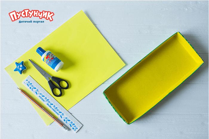 1. Возьми крышку от коробки для обуви. Выстели её дно и внутренние стенки желтым картоном. Для этого тебе нужно измерить длину, ширину и высоту внутренней стороны крышки. Приклей картон к основе.