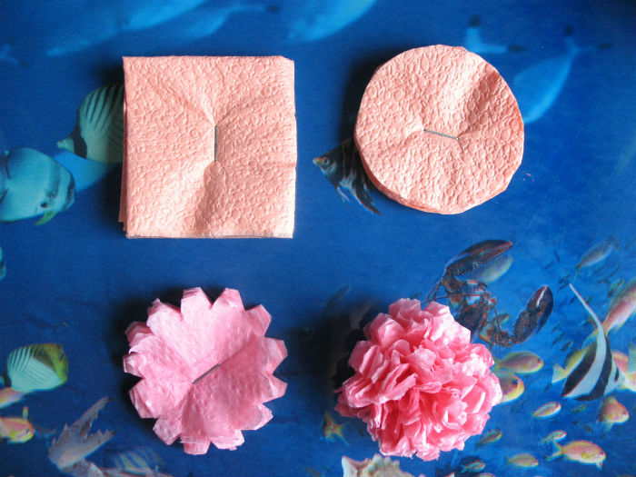 Приступим к изготовлению цветочков. Это очень просто! Берем салфетку и складываем ее вчетверо. В серединке скрепляем степлером. Обрезаем края, чтоб получился круг. Дополнительно можно вырезать треугольники по краям. А затем просто приподнимаем слои салфетки вверх, чтобы «распушить» цветок.