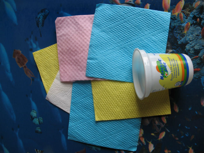 Стаканчик обклеиваем голубой бумагой. Можно вначале стакан обклеить белой салфеткой, чтоб не просвечивалась картинка. Здесь стараемся все сделать ровно и без складок. Можно и в 2 слоя.