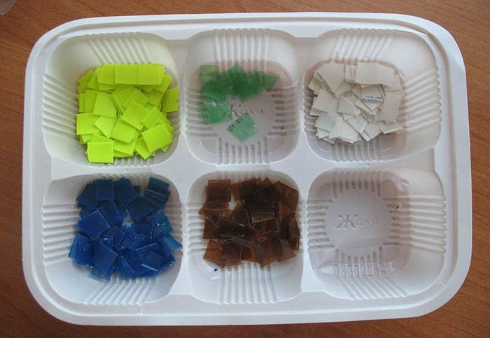 Геометрическая точность не нужна, поэтому легко можно доверить это дело ребенку. Удобно помещать кусочки одного цвета, например, в формочки для зефира. Тогда их легче использовать.