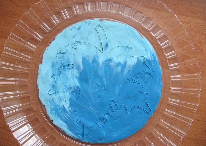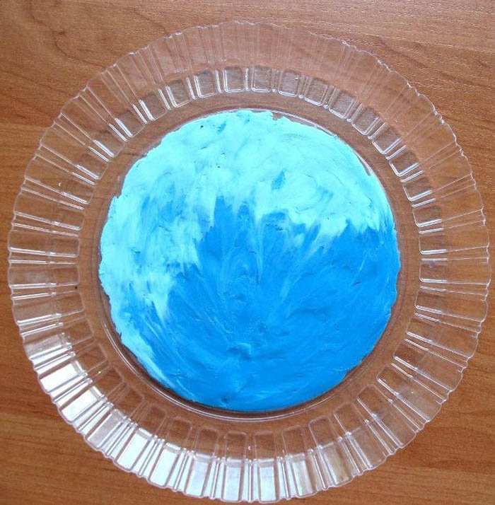 2. Берем небольшое количество пластилина и размазываем пальцем по заготовке. Как правило, ребенку нравится такая работа. Хоть она и требует времени и терпения. К тому же, можно смешивать синий и голубой цвет как угодно.