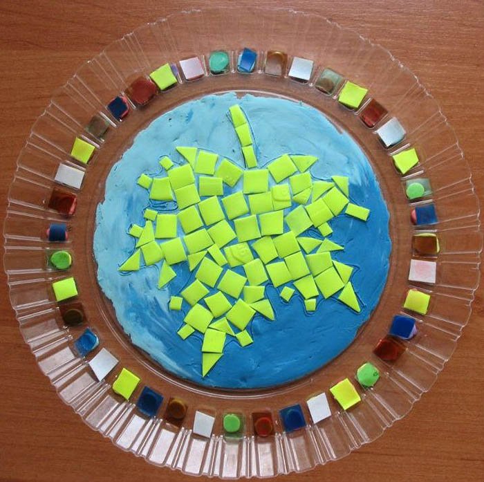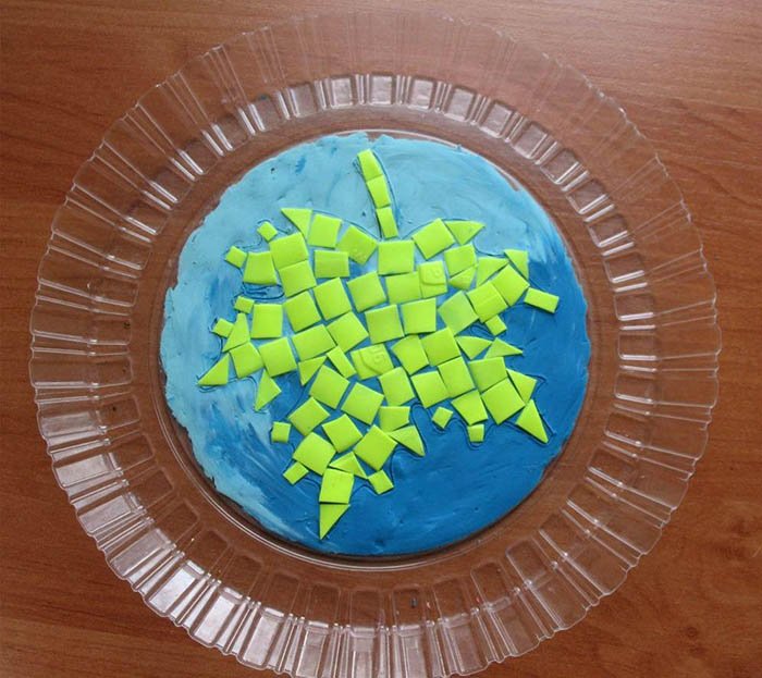 6. Осталось украсить нашу поделку. Для этого из маленьких кусочков разноцветного пластилина формируем шарики и прикрепляем вокруг листочка к крышке тортика. А потом на эти шарики выкладываем разноцветные пластиковые квадратики.
