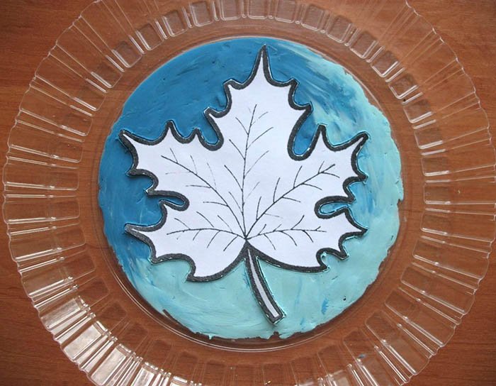 4. Прикладываем шаблон кленового листочка к пластилину и зубочисткой обводим контур.