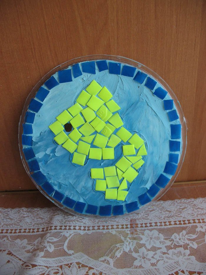 5. А теперь самое интересное — выкладывание мозаики. Берем отрезки бутылки желтого цвета и заполняем лист. В уголках можно прикрепить отрезки в форме треугольников.