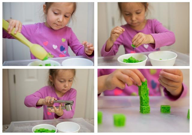 У Тебя есть младший братик или сестричка? Вторник — еще одна прекрасная возможность весело провести вместе время. Попросите у мамы несколько губок для мытья посуды, разрежьте их на маленькие кусочки и, поместив в большую миску, как следует намочите. Подготовьте два сосуда. А теперь самое интересное: вооружившись чеснокодавками, устраиваем соревнования — быстро достаем из миски кусочки мочалок и отжимаем воду, каждый в свой сосуд. Кому удастся больше отжать воды, тот и победил.