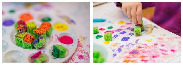 Чтобы усложнить задачу, можно доставать квадратики щипцами. Вволю наигравшись с водой, берем палитру и используем крошечные губки в качестве штампов. Нарисуйте фломастерами деревце и с помощью штампиков сделайте ему роскошный осенний наряд.