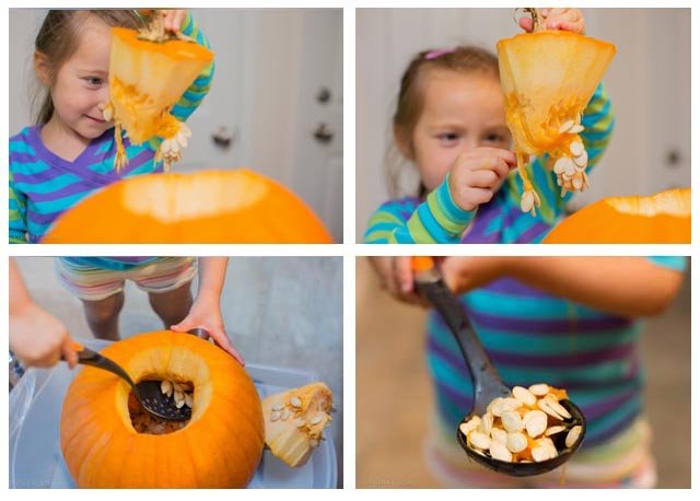 Отрезаем верхушку тыквы и проверяем свои предположения. Берем большую ложку и вынимаем содержимое тыквы наружу. Еще интереснее это делать руками.