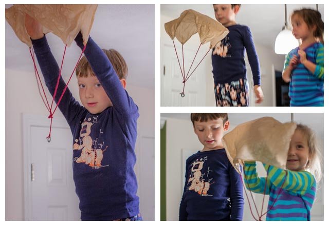 Экспресс-вариант: просто привяжи к ручкам полиэтиленового пакетика нить с катушкой, чтобы регулировать высоту полета самодельного парашюта. Работает! Сам проверял.