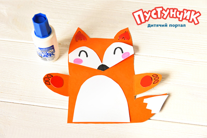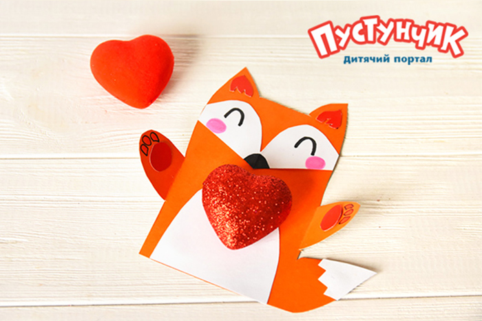 5. Приклей детали к заготовке и вложи в лапки сердечко. Это может быть крошечный сувенир, сладкая конфетка или шкатулка с бижутерией. Приклей сердечко к лисичке с помощью капельки клея.