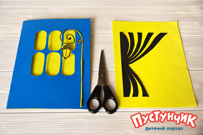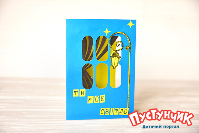 6. Приклей шторы к окну изнутри открытки. А фонарь приклей сбоку на титульной странице. Укрась валентинку желтыми звездочками.