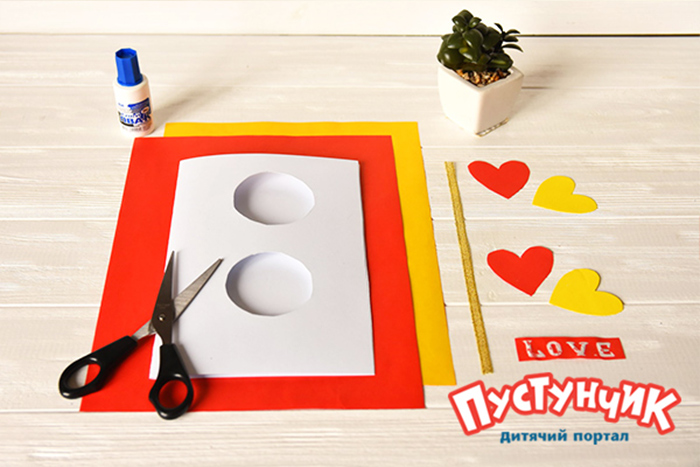 Там, где лента проходит сквозь круглые отверстия, обклей её с обеих сторон желтыми и красными сердечками.