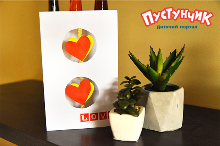4. Из цветной бумаги вырежи сердечки: два желтых и два красных. На полоске красной бумаги белой краской напиши слово «Love». Разрежь надпись на кусочки.