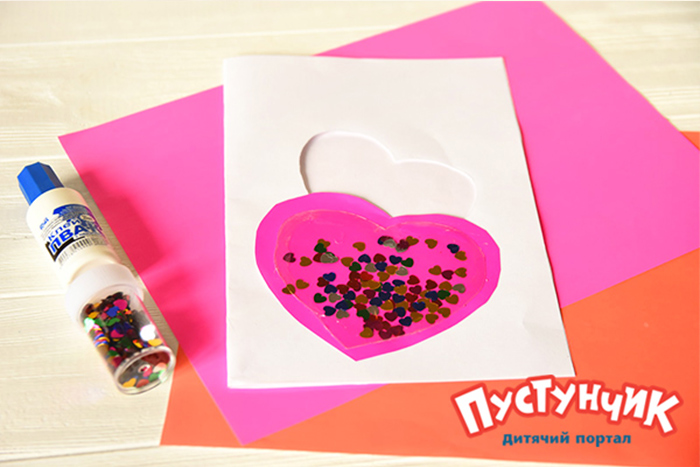 4. В центр розового сердца насыпь разноцветных пайеток в форме сердечек. Помажь прозрачное сердце вдоль края клеем ПВА и прикрепи к розовому. Оставь под прессом на некоторое время.