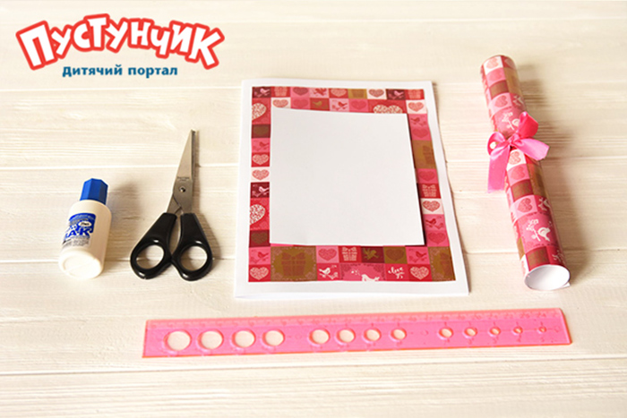 2. Отступив 1 см от правого края открытки, проведи продольную линию. Обрежь основу валентинки, чтобы сделать открытку уже.