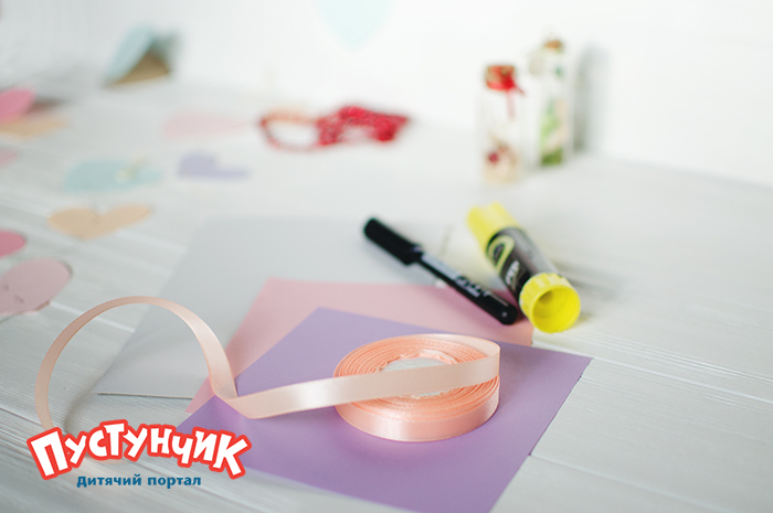 1. Из цветной бумаги вырезаем 4 сердечка одинаковых размеров и облака.