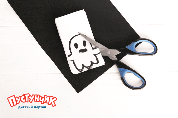 Шаг 2. Осторожно вырезаем по контуру. Важная деталь: обязательно надо оставить соединительный элемент, иначе не получится сделать из фигурок призраков гирлянду.