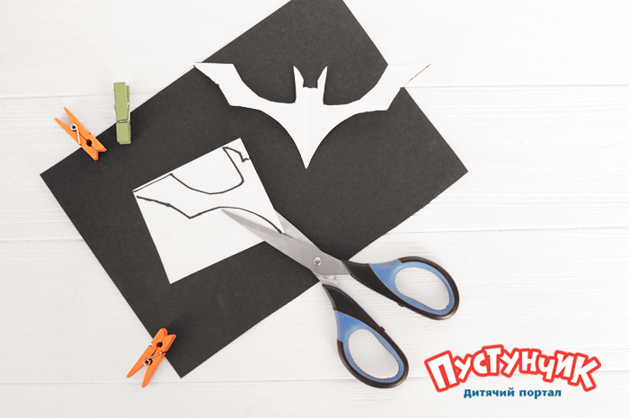 Шаг 1. Делаем заготовку. Любого цвета картон складываем пополам и рисуем силуэт летучей мыши. Осторожно вырезаем и разворачиваем.