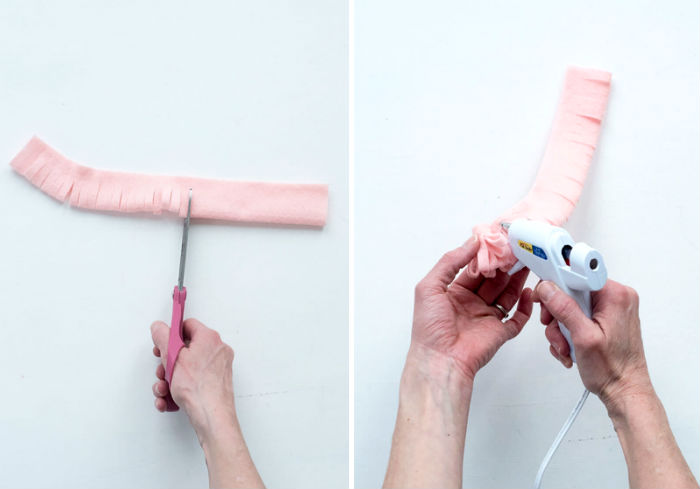 1. Для изготовления первого цветочка отрежь долгий клочок фетра, сложи пополам. Закрепи каплями горячего клея.