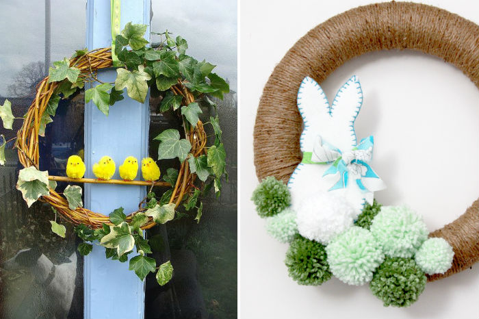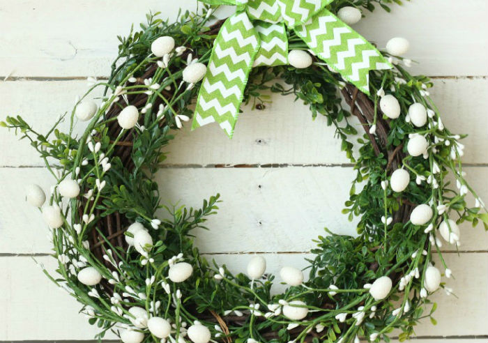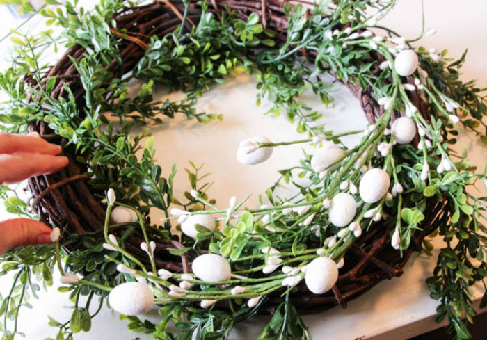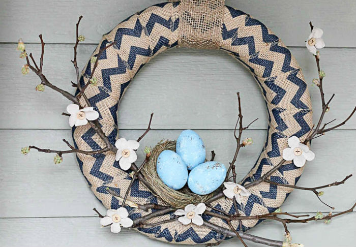 Украсить праздничный венок можно птичками, муляжами яиц, льняной тканью или нитками.