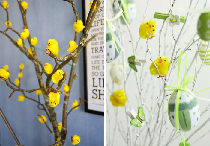 А если хочешь добавить поделке мимишности, обклей веточки крошечными цыплятами. Купить их можно в сувенирных магазинах. Получается очень теплая, солнечная композиция!