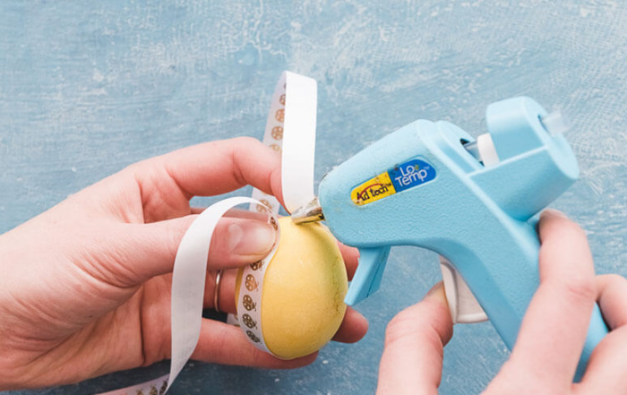 1. Все очень просто. Отрежь около 30 см ленты. Закрепи вокруг яйца капельками горячего клея. Сверху сделай петельку и завяжи бантик.