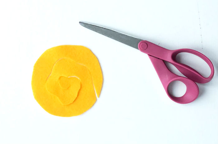 4. А теперь сделай бутоны цветов. Для этого вырежи из фетра кружочки и разрежь по спирали. Сверни, начиная от середины, и склей, чтобы цветы не распались.
