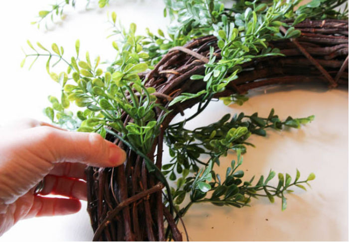 1. Обмотай основу веночка искусственными зелеными веточками.