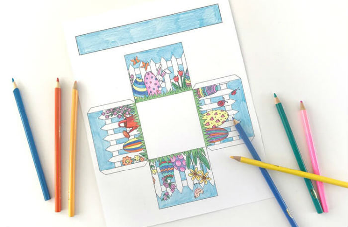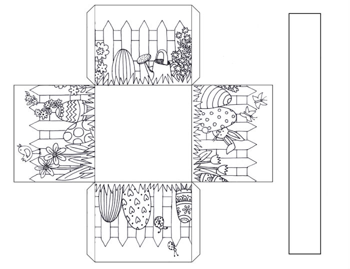 1. Распечатай или нарисуй от руки вот такую развертку. Твою пасхальную корзину может украшать что угодно: рисунки цыплят, ивовых котиков, пасхальных кроликов или писанок.