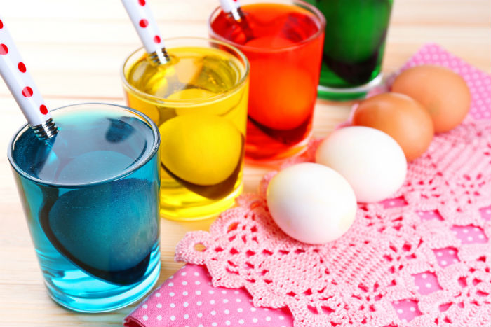 3. Начинаем колдовать! Опусти яйца в стаканы с разноцветными растворами воды и красителей (сохраняй пропорции, указанные на упаковке). В каждый стакан добавь столовую ложку уксуса. Подожди 5–7 минут. Регулярно переворачивай яйца, чтобы краска взялась равномерно.