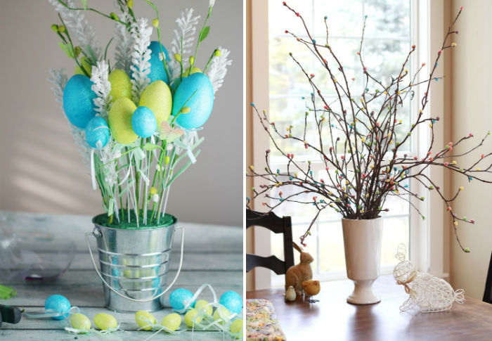 Для декора пасхального дерева часто используют фасоль, окрашенную в разные цвета. Цветущие искусственные веточки с пасхальными яйцами сверху также имеют непревзойденный вид.