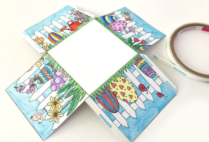 3. Вырежи ручку и заготовку корзины, сделай необходимые сгибы. Склей с помощью двустороннего скотча. Прикрепи ручку.