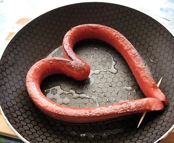 В хлебе вырезаем сердечко так, чтобы туда можно было поместить сформированное из сосиски сердечко.